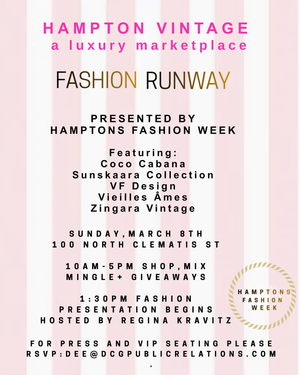 The runway show, produced by Hampton's Fashion Week, will also spotlight an exciting lineup of participating designers and curated by Hampton Vintage Market with vintage brands including Coco Cabana Shop, VF Design, Vielles Ames, and Zingara Vintage, creating a dynamic fusion of heritage fashion and forward-thinking sustainability. Cindy Guyer, a West Palm Beach Influencer, will also be gracing the runway.