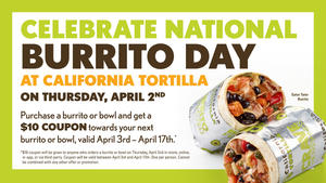 POTOMAC, MD, April 01, 2026 -- California Tortilla, the fast-casual restaurant known for its bold "California-style" Mexican food, is celebrating National Burrito Day with a deal to keep guests coming back for more. On Thursday, April 2, guests who buy any burrito will score a $10 coupon to use on a future visit between April 3rd and April 17.
