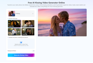 Mango AI's AI Kissing Generator Free simplifies the creation of heartfelt, animated kiss scenes. Powered by advanced AI technology, it enables users to easily produce lifelike kiss videos in various styles.
